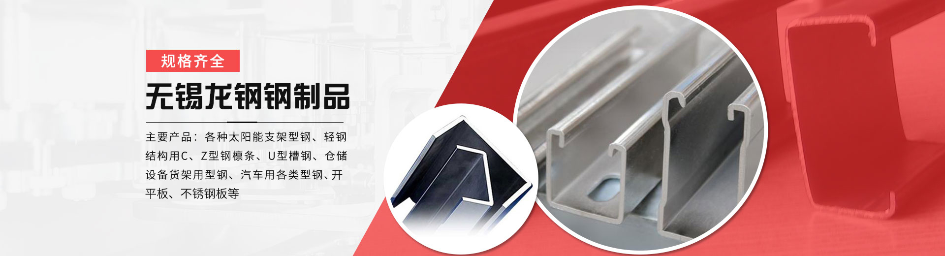 無(wú)錫市龍鋼鋼制品有限公司位于風(fēng)景秀麗的太湖之濱---無(wú)錫前洲鎮(zhèn),緊依滬寧高速玉祁出口,前洲工業(yè)園,交通十分便利,地理位置優(yōu)越。本公司是生產(chǎn)各種冷彎型鋼的專(zhuān)業(yè)廠家,公司擁有雄厚的技術(shù)力量,優(yōu)越的生產(chǎn)設(shè)備,良好的生產(chǎn)工藝,完善的質(zhì)量保障體系。主要產(chǎn)品:各種太陽(yáng)能支架型鋼、輕鋼結(jié)構(gòu)用C、Z型鋼檁條、U型槽鋼、倉(cāng)儲(chǔ)設(shè)備貨架用型鋼、汽車(chē)用各類(lèi)型鋼、懸掛鏈輸送機(jī)導(dǎo)軌、公路護(hù)攔板及各種非標(biāo)冷彎型鋼和各類(lèi)高頻焊管。無(wú)錫龍鋼愿與您攜手共進(jìn),走向未來(lái)、共創(chuàng)輝煌。